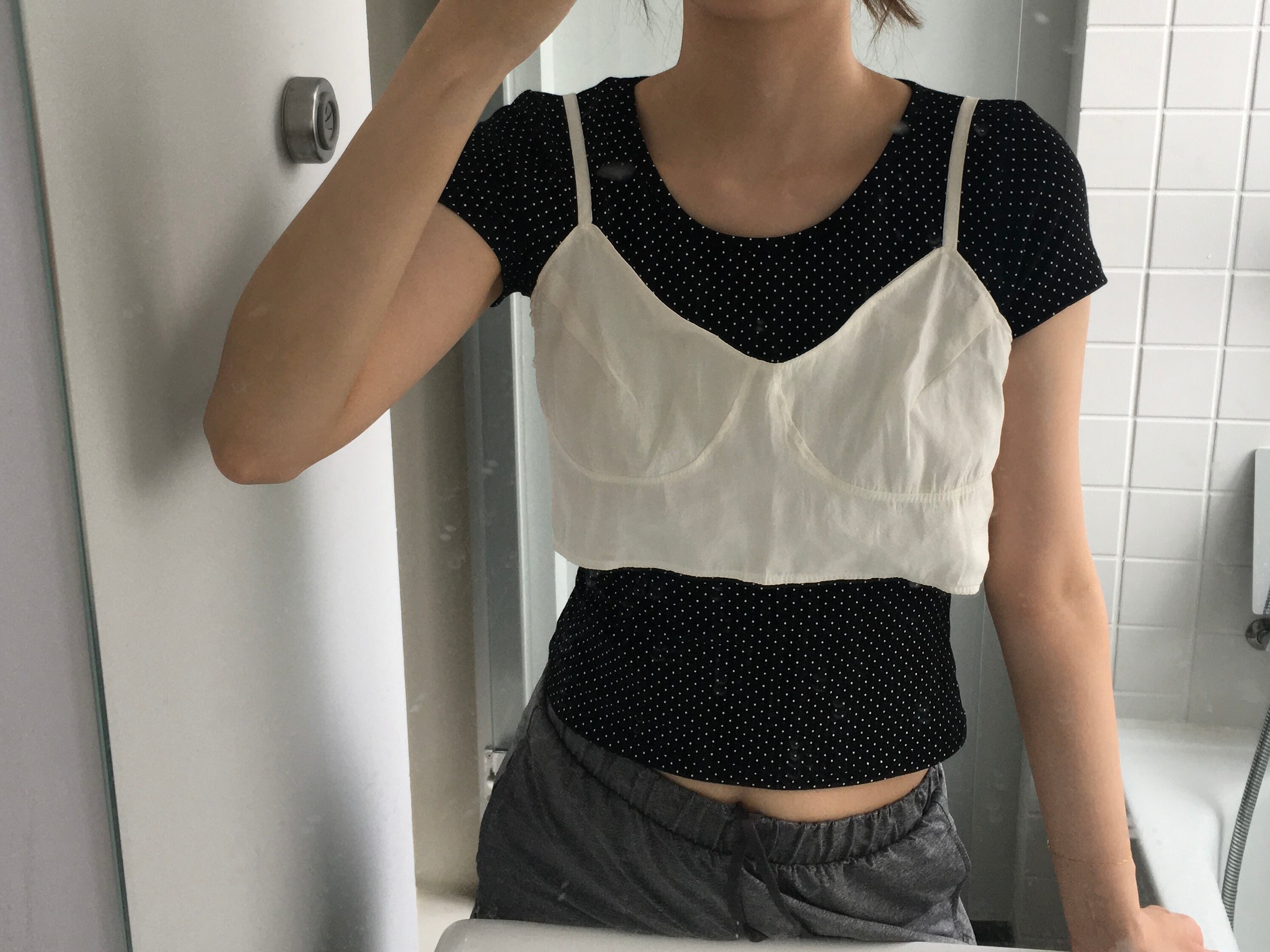 大人っぽく着れる細かいドット柄トップス。